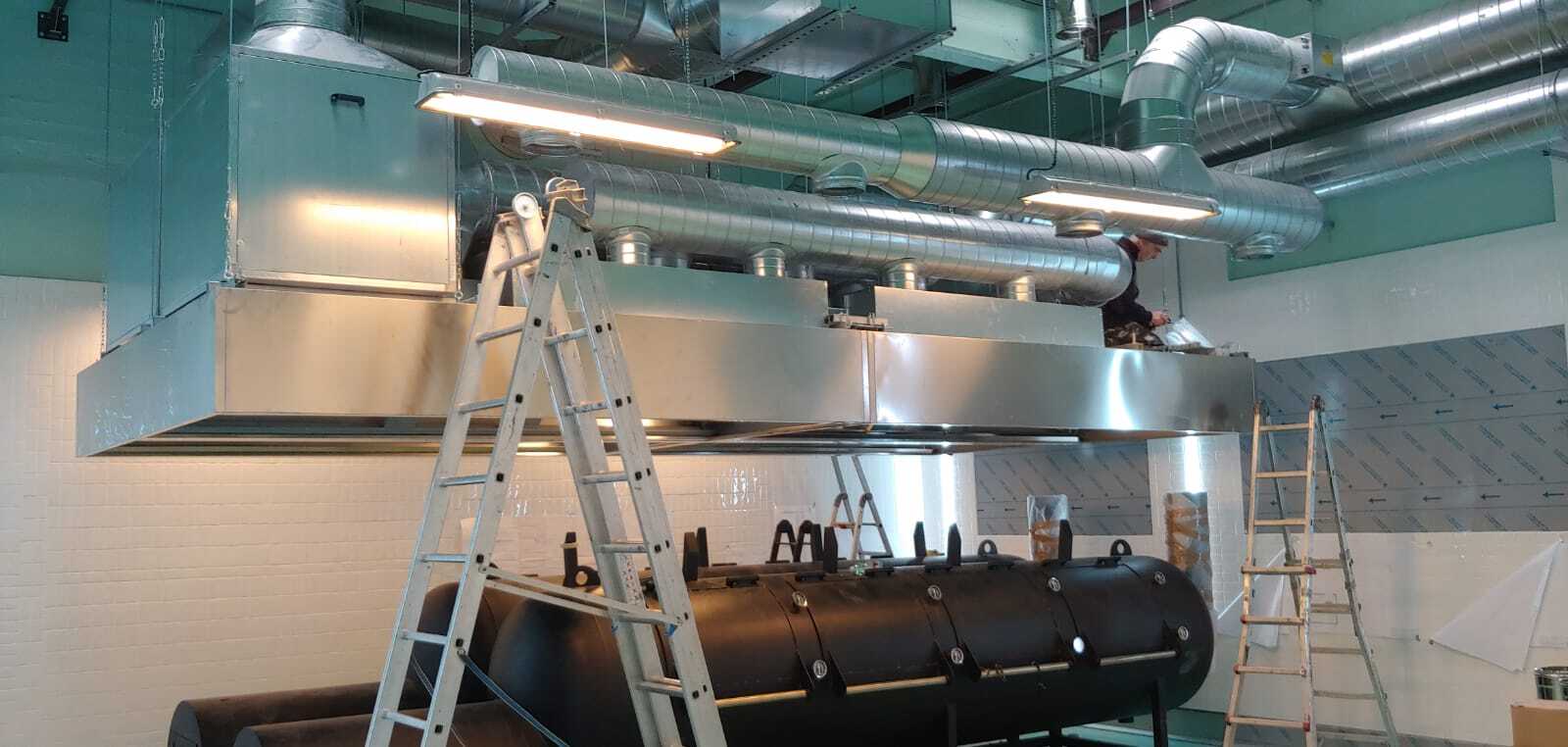 Tested meat laboratory mechanical ventilation system for 30,000 Nmc/h with treatment of cooking vapors and combustion products.